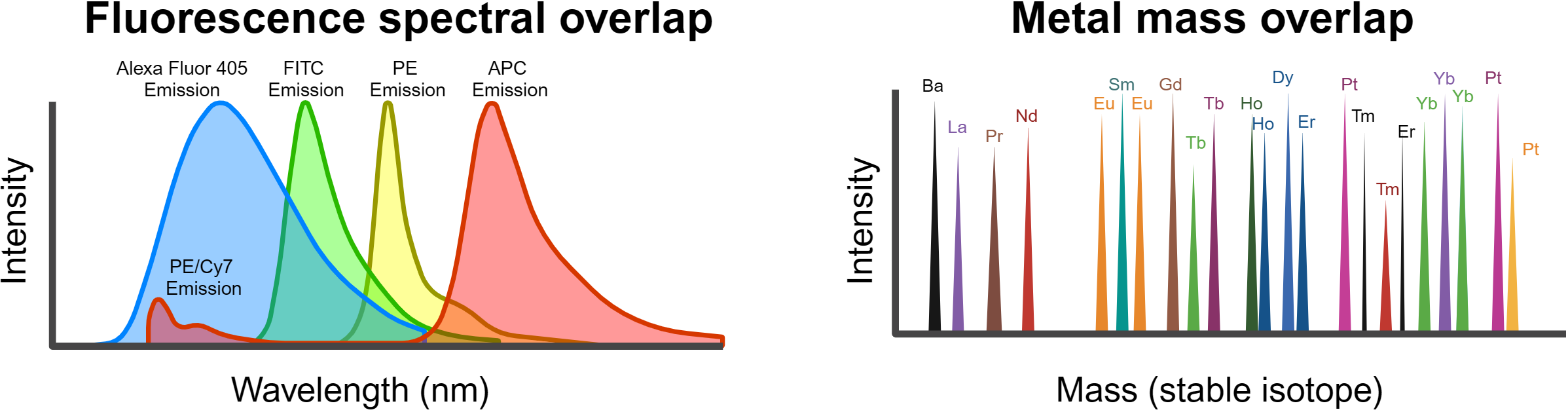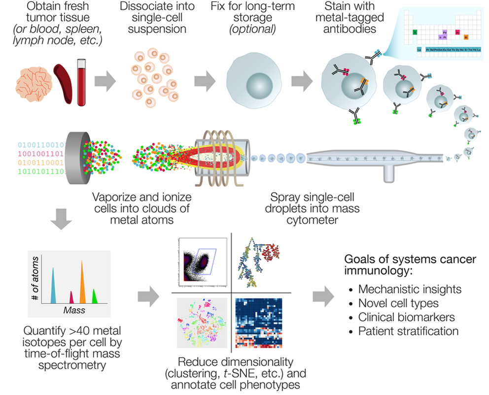 CyTOF® 또는 질량분석기술은 단일 세포의 관심 항원에 세포 내 또는 세포 외로 금속 결합된 항체를 검출하기 위한, 유세포분석기술(Flow Cytometry) 및 질량분석기술(Mass Spectrometry)의 하이브리드 기술