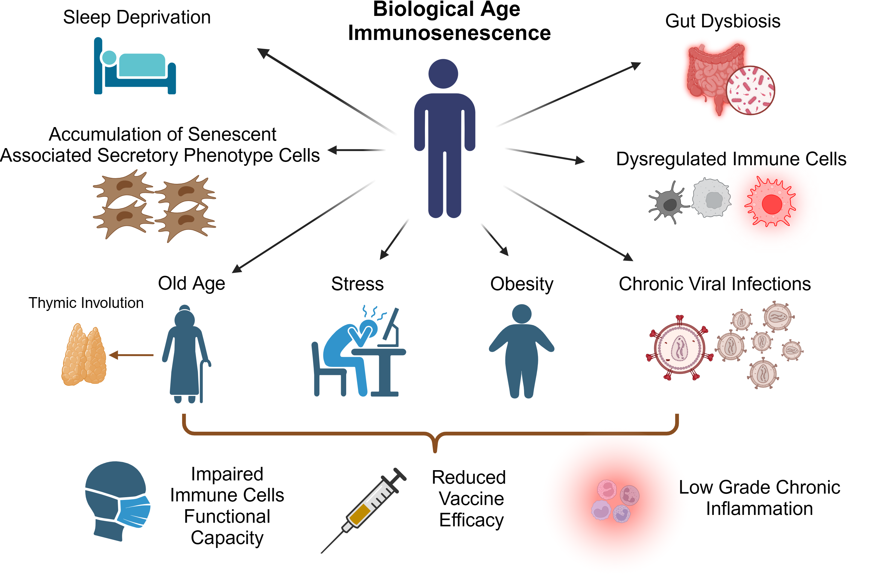 • Immune aging is associated with reduced efficacy of vaccination and increased susceptibility to infectious diseases, cancer, neurodegenerative diseases including dementia, cardiovascular diseases, hypertension, diabetes and metabolic diseases, autoimmune diseases, etc.